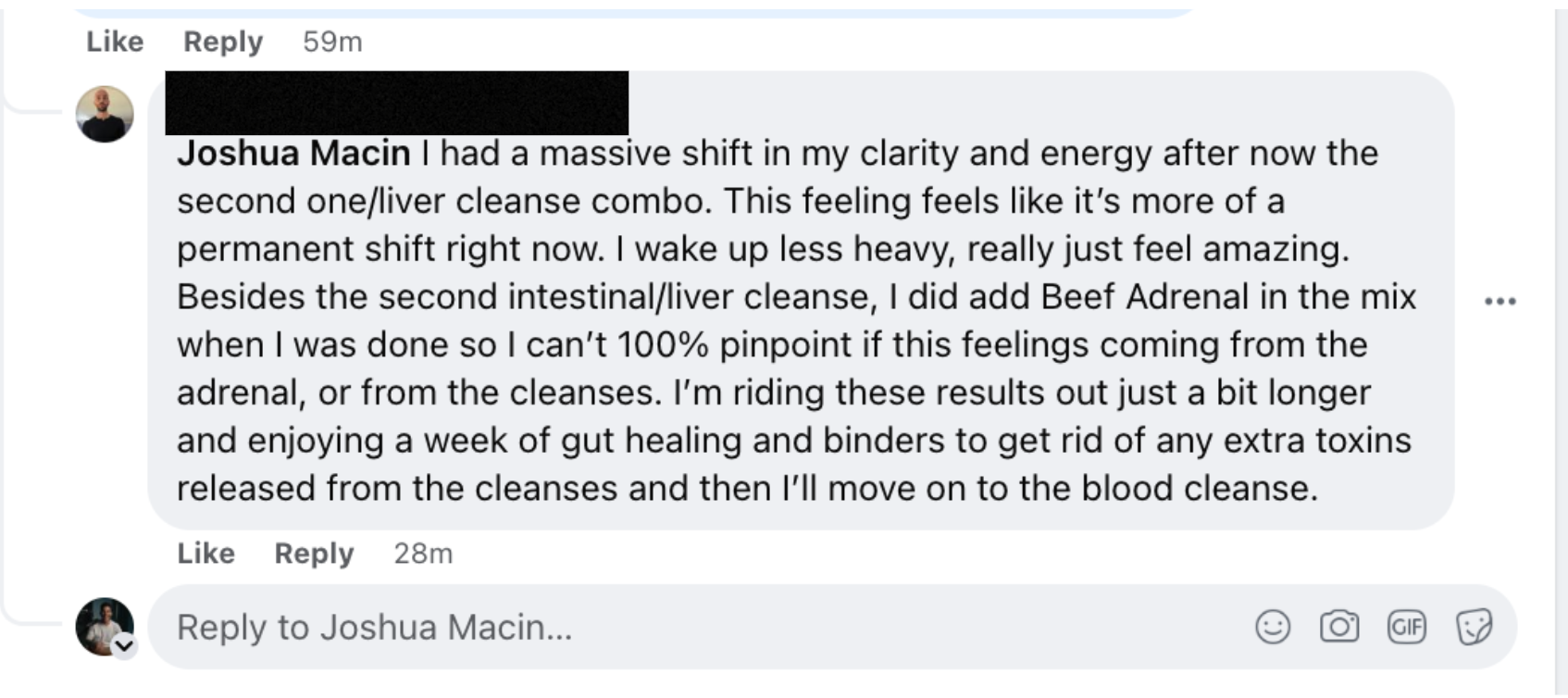 "I don't know how to fully encapsulate how life-changing this can be. I wasn't very interested in detox at first. I thought I was pretty healthy already. Wow, was I wrong about that! I eventually decided to try his course and after about two months, there was a noticeable difference in my mood and energy level. I was hooked. After a few months, I felt like a new man. I recommend Josh 100% to any and everybody. It made a huge difference in my life even when I already felt like I was pretty close to my potential in terms of health and happiness."